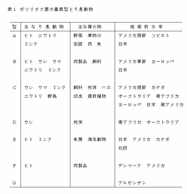 ボツリヌス菌はグラム陽性菌で芽胞を形成し、数本の鞭毛を持って運動性がある。ボツリヌス菌は産生する毒素によってAからG型まで7型に分離され、ヒトの食中毒を起こすのは、A、B、E、Fの4型である。本菌の毒素型と、り患動物、主な媒介物(食品)および地域的分布を表1に示した。