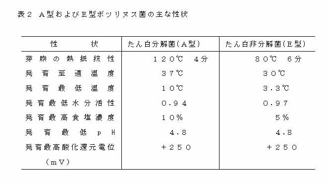 ボツリヌス菌の生化学的性状等の詳細は専門書に譲り、ここでは省略するが、食品工業にとって関連の深いA型菌(たん白分解性)、および北海道・東北で発生する“いずし”によるボツリヌス中毒の原因菌となるE型菌(たん白非分解性)の主な性状を比較したのが表2である。