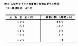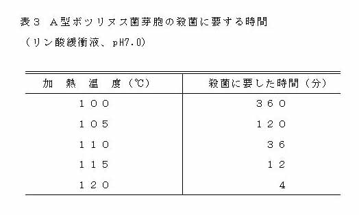 ボツリヌス菌の中でA、B型菌芽胞は特に耐熱性が強大であって、古くから缶びん詰の加熱殺菌の目標とされてきた。A型菌芽胞の耐熱性は表3に示したように、100℃の沸騰水の中で完全に殺滅するには6時間もかかる。わが国では、昭和49年にフリルフラマイド(AF2)が使用禁止になったが、これに伴い常温で保存・流通する魚肉ハム・ソー
