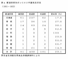 諸外国の事例を見ると、米国では1899〜1975年に722件、患者数1,833名、うち死者数987名(致命率53.8%)、カナダ(1919〜1973年)では62件、患者数181名、うち死者数84名(致命率46.4%)である。一般に諸外