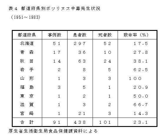 わが国におけるボツリヌス中毒の発生の歴史は比較的新しく、昭和26年北海道岩内町で自家製の“いずし”によって14名が発病し、4名が死亡したのが最初の公式報告例で、それ以来毎年1〜2件発生していて、昭和59年までに95件、482名の患者が発生し、112名が死亡している(致命率23.2%)。
