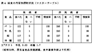 表4には、南国市の学校給食で発生したナグビブリオ食中毒における原因食品の究明のため作成したマスターテーブルを示した。