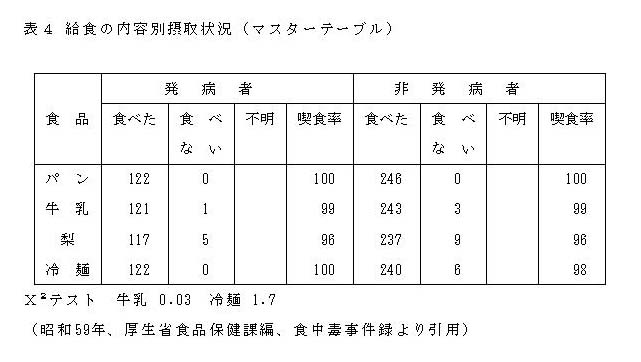 ついて、食べたか食べなかったかを発病者・非発病者に分けて表を作り、各食品について、患者の喫食率と非発病者の喫食率の間で差のあるものに注目し、両群の発病率について統計的に有意差があるかどうかを調べ、原因食品推定の補助とする。有意差の検定には一般にX2(カイ二乗)検定法を用いる。しかし、このような推計学的な推定結果だけ